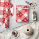Wrapping paper in a large, deep red and white buffalo plaid pattern, with a flurry white snowflakes