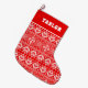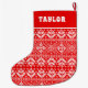 This fun and festive stocking can be personalised with a name. It features a winter fair isle pattern on a red background. This is perfect for Christmas and the winter holiday.