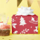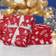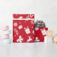 A red wrapping paper with a white Christmas pattern, featuring Christmas trees, reindeers, gifts, snowflakes, stars, bows, rocking horses, sleighs, holly leaves, bells, branches, and Santa hats.