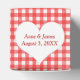White heart with newlywed names on red and white gingham background.