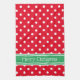 This cute kitchen towel features crisp white polka dots on a background of bright red. Personalise the holiday green and white stripe with your choice of special text. Makes a great housewarming gift at Christmas!