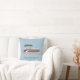 This throw pillow is ready to be customised with the name of your boat or other custom text. It features an illustration of a pontoon boat in red with white accents, with your text in grey lettering set against a light blue background.