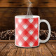 A coffee mug with a retro country red and white striped or plaid pattern.