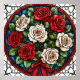 Vibrant red and white roses, detailed leaves, and a symmetrical circular design