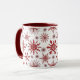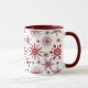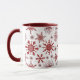 This is a beautiful mug with a snowflake pattern in dark red/maroon, on a white background. Enjoy your warm drinks in this festive mug.