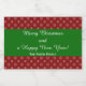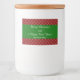 Red and white snowflakes pattern food container label. A red background with a snowflake pattern and the text "Merry Christmas and a happy new year!" on a green band in the middle.