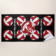 This girls' volleyball team colours personalised beach towel features a pattern of red and white stylised volleyballs arranged in a mirrored pattern with text that reads, "I love volleyball" - her name and jersey number are customisable - by katz_d_zynes