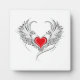 Artistically painted red heart with angel wings grey, decorated with black smooth contour.