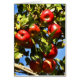This seasonal fine art blank note card features an autumn scene of an apple tree full of delicious red apples, surrounded by green leaves and blue sky.