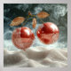 Two glossy, red apples suspended in mid-air, connected by a slender stem. Each apple is partially submerged in clear water, with droplets and bubbles capturing the light beautifully. The apples are adorned with delicate, metallic leaves that add a touch of elegance. In the background, a soft, smoky gradient complements the scene, while the surface below resembles smooth, sandy terrain, sparkling with moisture. The overall composition conveys a sense of freshness and artistic beauty.