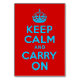 A classic "Keep Calm and Carry On" style design with modern colours of red and aqua.