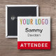Easily personalise our square attendee name badge with your event logo, attendee name, or other custom text. It attaches with a safety pin back. Designed in red and other colours (all colours are customisable). Our square buttons are 2 inch x 2 inch. Made in USA. No minimum order quantity and no setup fee.