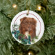 On the front of this Holiday ornament is a portrait of a beautiful red Australian Shepherd Dog peeking out of a holly and evergreen bough. Red berries and pine cones decorate the holly and pine sprigs. The image is placed on a white circle within a thin red line circle. The back of the ornament has the same evergreen bough wreath and circle with your custom text in red.