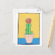 This cute art postcard has a simple drawing of a red ball cactus. The cactus is green with a red top and is in a pinky beige flower pot. There is a yellow and blue background with a black line surround. The background of the card is white. The artwork is original and only available from The Art of Being Beth at Zazzle.