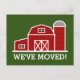 Red barn farm house change of address moving postcard. Cute moving cards for new home or relocation. Fun design for new home, business, company, Midwest farming etc. Rural red paint farmhouse and silo drawing design with modern typography.