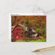 The brilliance of a sunny autumn day is celebrated on this beautiful fine art photography postcard. Here is a crimson barn in a valley at the bottom of a hill which is covered with lovely fall foliage colours of red, orange, yellow, gold and green. The photograph has been enhanced to create an impressionistic, artistic effect.