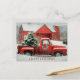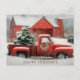 A dusting of snow blankets the barn's roof and eaves, while the quaint windows peek through, framing views of snow-kissed evergreens. The heartwarming touch is brought to life by the presence of a classic red truck, a true hallmark of tradition. Nestled in its bed, a resplendent Christmas tree awaits its place in the celebrations, spreading joy and wonder.