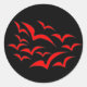 This set of round stickers features a collection of simple images of bats flying together in a cloud pattern. The bats are red and the background is black. Kids are sure to love this cute design.