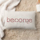 BECOME in red stitched inspirational text with needle and thread on light cream coloured textured background
