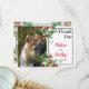 Vibrant colours of red holly berries and greenery with white roses garden floral swag wedding "Thank You" design originally illustrated and designed by Holiday Hearts Designs (rights reserved) exclusively for Zazzle with template photo credit to Daniel Suarez via Unsplash. Front features your photo on the left with two central floral swags overlapping a white panel with a rectangular black frame. Front message is "Thank You from" the bride and groom and your wedding date. The back features a corner floral bouquets in all four corners with a black rectangular frame beneath with your message, closing and typed signatures.