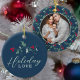 Dark blue background and shades of green and red holly festive patterned holiday photo ornament. . Customise with your own photo. Reads holiday love on the back or can be personalised with your own message. Other matching items are available and can be created on request. © Original design by www.mylittleeden.com on Zazzle.