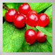 Bright red berries with lingering raindrops against vivid green leaves close up. Nature photography by Susan. This image is available on many cards and products in my main store Smilin' Eyes Treasures. Visit my Profile page to find links to all of my stores.