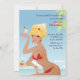 A gorgeous, sun-tanned girl is featured holding a drink and wearing a red bikini. A perfect summer-theme invitation to a party.