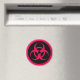 Biohazard symbol refrigerator magnet in red and black.