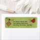Holiday return address labels with a red bird, holly, and patterned red and green ornament on a green background and an area you can easily customise with your address and name.