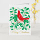 A unique modern vintage woodcut inspired foil holiday greeting featuring a red bird with a green holly and a shiny foil berries pattern. Available in a