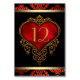 Red, black and gold wedding table number cards with rich red satin heart and red black and gold damask background. This elegant red, black and gold wedding table number card is easily customised with your event details. Simply add the table number and it will automatically put the number on both sides, add it to your cart and do this as many times as needed for your number of tables.