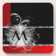 Personalise this chic elegant plain bright vivid red coloured modern contemporary striped pattern and black background and silver grey metal look ornate vintage baroque monogrammed swirl circle design on a black stripe by adding your monogram initials to the template to make a unique modern custom personalised gift. PLEASE NOTE the silver is not metallic.