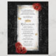 You can fully personalise the elegant black calligraphy ("My Quinceañera") and modern typefaces to reflect your own party. Feel free to rearrange art elements to your liking. Should you edit the design further, you can uncover a warm tan vintage parchment paper texture should you prefer that over the white. These DIY invitations offer a one-of-a-kind, enchanting presentation perfect for marking a milestone in unforgettable style. Category: handmade scroll wedding invitations; scroll wedding invitations with butterflies; and RSVP DIY black white and red quinceanera scroll invitations. Black and red quince theme party colours: black, white, red and gold (with silver options).
