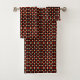 A decorative towel and washcloth feature a geometric diamond pattern in red, black, beige, and brown tones, conveying a bold, stylish design.
