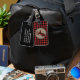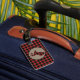 The background on this luggage tag is a red and black buffalo plaid pattern. At the centre is a tan circle banner with a matching red and black plaid silhouette deer. The back of the tag is black with two fields for your easy to read custom text in white.