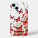Showcase your love for nature with this beautiful phone case featuring watercolor red butterflies with black outlines, gracefully fluttering in a white field of vibrant red flowers and lush green foliage. The design is complemented by a red monogram name box adorned with red jewels, a gold outline, and bedazzling stars, offering a stunning space to personalise with your name. This case merges the beauty of nature with elegant customisation, making it a perfect, eye-catching accessory for your phone.