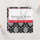 Black and White Vintage Damask Wedding Invitation with bright red accent colour personalised with your bride and groom first names and last name initial or monogram for a monogrammed wedding logo design. These versatile, create your own, wedding invitations are perfect to send out as individualised invitations. On these modern wedding invitations there is a space on the invitation text for you to handwrite the guests' name in beautiful calligraphy. Also the text is customisable, but as it is shown, it incorporates the wedding reception and the RSVP instructions directly on the same card. Layout design by Elke Clarke©. Graphics licensed for use.