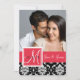 Elegant bright red accent colour with White Monogram with Black and White Vintage Damask Pattern Save the Date Flat Cards with Your Engagement Photo. Layout Design by Elke Clarke©. Graphics licensed. Customise by inserting your engagement photo, personal information and save the date message on the back. Customisable. Just click the "CUSTOMIZE" button.
