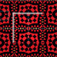 Seamless decorative geometric pattern featuring black and orange geometric shapes on a red background.
