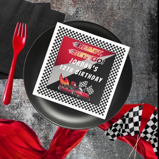 Race on over to celebrate a go kart racing-themed birthday. This birthday party design features a red and black go kart with a red helmeted drive and flames shooting out the back of the go kart. The words "Ready, Set, Go!" are also done in a flame-toned gradient. A pair of chequered flags are waving the driver off.