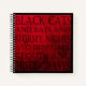 Dark textured red background with black text that reads: 'Cats and bats and stormy nights and deep dark clouds and misty graves.'