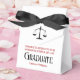 This modern custom law school graduation party favour box features the college graduate name in elegant red and black script for the class of 2024. Customise with your university under the scales of justice for a great graduation keepsake for a new lawyer or attorney.