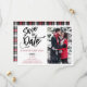 These Save the Date announcements are designed with a clean black, red and white design with a coordinating plaid pattern on the back. Customise with your own photo and text to announce your special day. Makes a great announcement for an elegant event or a winter wedding.