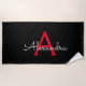 Black and Red Monogram Name Beach Towel. This makes the perfect sweet 16 birthday, wedding, bridal shower, anniversary, baby shower or bachelorette party gift for someone that loves glam luxury and chic styles.