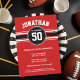 Black Stripes and an red background highlight this sport themed birthday party invitation. The design includes a sports jersey circle and stripes with an area to highlight the Birthday Boy's Name and Age. Include any party information and choose between a print or download option.