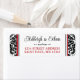 These black and white damask pattern wedding return address labels have a damask pattern on the left and right sides with the text area in white with black and red edges in the centre that match the wedding invitation set below. Your name(s) and return address are in red and black with an ornate black scroll divider between them.