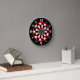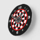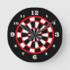 This bold design in red, black and white resembles a dartboard & makes a perfect clock for a game room. White numbers stand out on the black outer ring of the clock. The larger numbers on the chapter ring mark each quarter hour. The design will work on round or square clocks.