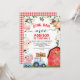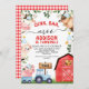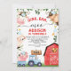 Sweet farm themed birthday invitation featuring a farmyard scene with various farm animals, foliage, flowers and red barn and blue tractor. This oink baa moo farmyard birthday invitation is a sweet way to invite guests to a farm themed birthday party.