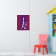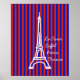 Graphic white Eiffel Tower with text over a striped background with the french colours