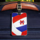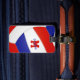 This simply designed volleyball themed luggage tag features the realistic image of an abstractly oversized volleyball that has red, blue & white panels - personalise with player name and monogram on the front, address and phone number on the back - by katz_d_zynes